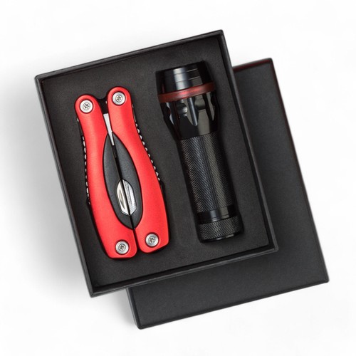Coffret pratique Colorado II contenant une torche et un grand multi-outil. Lampe de poche est fait d’aluminium. Génère lumière focalisée. Multi-outil professionnel et pratique comprend un système professionnel de distension et de la fonction de sécurité avant de fermer les lames. L’ensemble est emballé dans une boîte en carton.