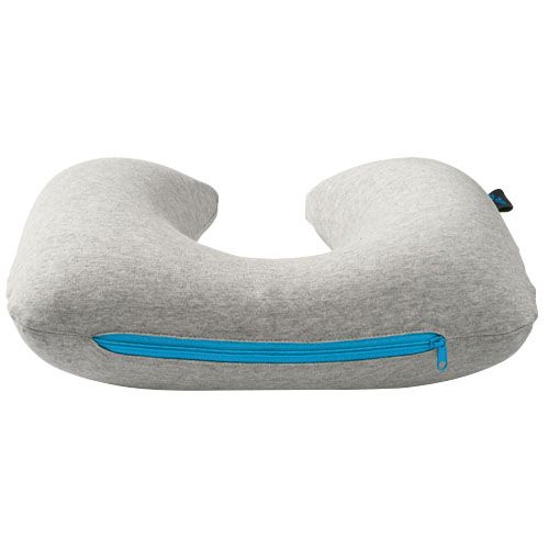 Ensemble de voyage souple contenant un oreiller gonflable avec zip bleu clair, bleu, un masque pour les yeux, des bouchons d’oreilles souples élastiques bleu clair et un étui souple avec cordon de serrage bleu vif.