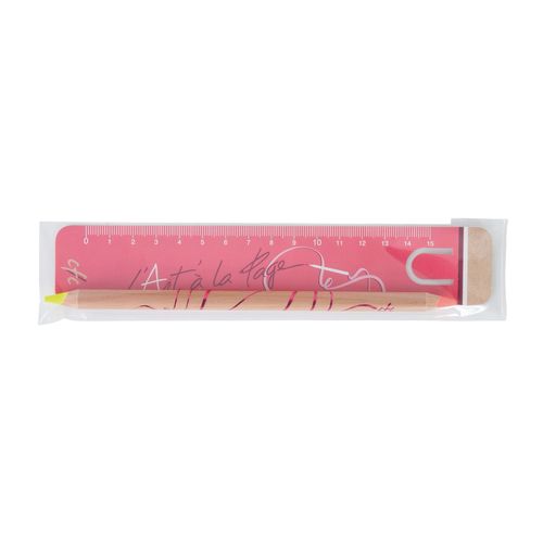 Dimensions : SACHET 19,5 x 4,5 – REGLE CARTON 19 x 3,5 – surligneur 17,6 x 0,85 cm