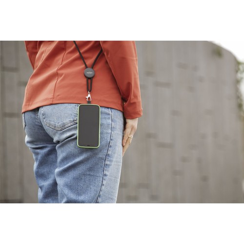 Cordelière téléphonique régable avec cordon rond fabriqué en 100% polyester GRS RPET. Avec mousqueton en métal, boucle réglable, stoppeurs en aluminium et une étiquette ronde en plastique recyclé. Le patch universel permet d’attacher votre smartphone à votre lanyard. Ce système vous permet de porter votre smartphone en toute sécurité autour de votre cou. Vous aurez ainsi votre téléphone rapidement à portée de main et vous garderez les mains et les poches de vos vêtements libres. Ce patch est compatible avec la plupart des combinaisons de smartphones et de coques, mais pas avec les coques à fond ouvert. Le système est conçu pour que le port de chargement de votre téléphone ne soit pas bloqué. Certifié GRS. Matière recyclée totale : 40%.