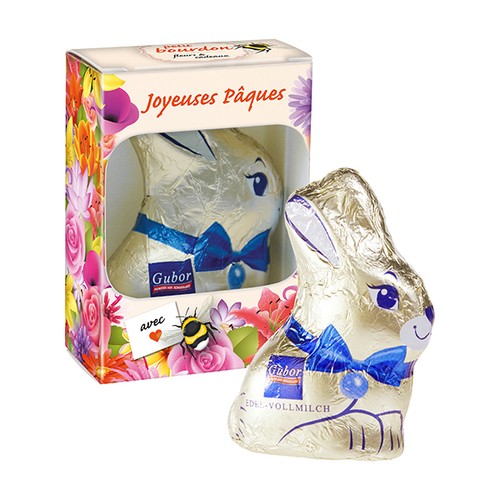 Lapin de Pâques de la marque Gubor, emballé dans une boîte cadeau avec fenêtre. Dans la limite des stocks disponibles. Remarque: L’emballage original est en allemand.