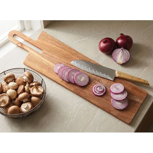 Acacia massif. Large trou dans le manche pour accrocher la planche sur un mur. Peut aussi servir comme planche de présentation.