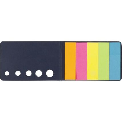 Etui cartonné de 300g/m² contenant 100 marque-pages repositionnables de 75g/m² dans 5 coloris différents.