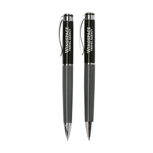 Ensemble d’écriture brillant : stylo à encre bleue à cliquet rotatif et porte-mines avec 3 mines HB (0,9 mm). Avec des accents en métal. Dans une boite.
