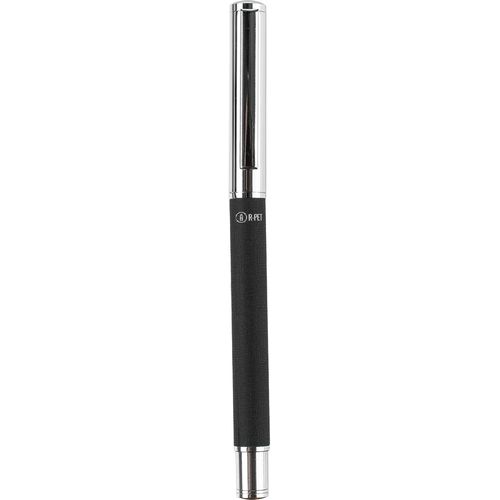 Roller en laiton et rPET avec clip et embase en métal, mine bleue. Mécanisme coulissant et logo rPET sur le corps. Emballé individuellement dans une boîte en kraft.