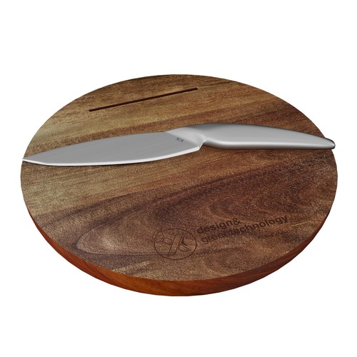 Set exclusif de planche à découper en bois d’acacia 100% FSC® et couteau en acier inoxydable, personnalisable avec un logo gravé au laser sur la planche.