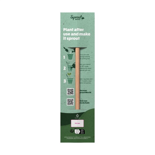 Crayon Sproutworld avec un message inspirant pour la nature. Ce crayon à la pointe aiguisée est en bois. À son extrémité se trouve une capsule (en cellulose) qui contient des graines. Une fois que le crayon est devenu trop petit pour écrire avec, plantez-le avec la capsule dans un peu de terre. Après 2-3 semaines, les graines commencent à germer et se transforment en jolies fleur, en herbes aromatiques ou en des légumes parfumés. Choisissez parmi différents types. Le nom de la plante choisie sera gravé sur le crayon. Le crayon ne contient pas de plomb et est donc totalement sûr. Fabriqué en Europe. Article complémentaire W387 : Carte en carton coloré dans laquelle le crayon peut être inséré. La carte contient des informations en anglais sur le produit. Cette carte confère au produit une valeur d’attention exclusive. Une évaluation du cycle de vie (LCA) de ce produit est disponible dans les téléchargements.